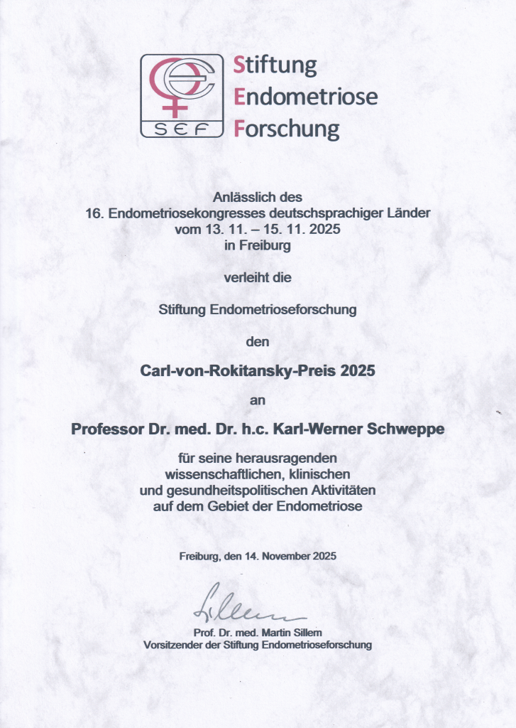 Herr Prof. Dr. K.-W. Schweppe erhielt den Rokitansky Preis der SEF auf dem 16. Endometriose-Kongress deutschsprachiger Ländern in Freiburg 2025.